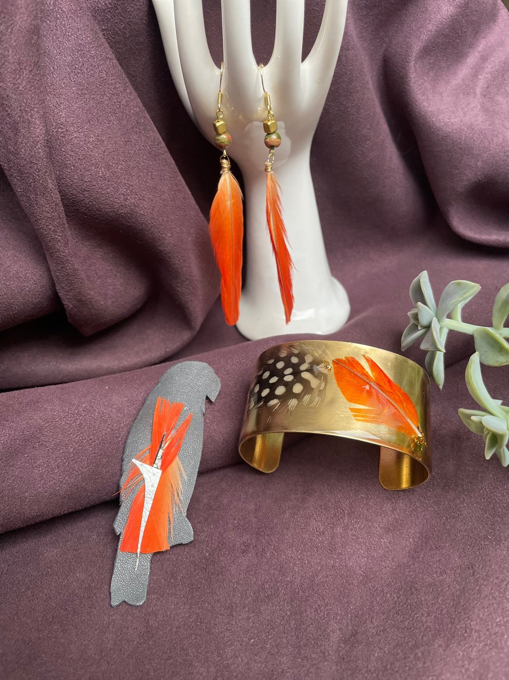 Ensuite, les boucles d'oreilles pierres-plumes ajoutent une touche de raffinement supplémentaire à la collection. Ces boucles d'oreilles combinent des pierres semi-précieuses d'unakite et des plumes du perroquet, créant une harmonie parfaite entre la nature et l'élégance. Les pierres ont été choisies par ma cliente pour leurs couleurs qui s'harmonisent avec celle des plumes du perroquet, mais je crois aussi, instinctivement, car l'unakite est réputée en lithothérapie pour favoriser l'amour et la libération des émotions "négatives" comme la tristesse : elle est ainsi souvent recommandée comme soutien en période de deuil.