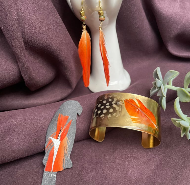 Cette commande sur-mesure démontre comment les bijoux peuvent servir de pont entre les souvenirs et le quotidien, en permettant de porter avec soi un hommage discret mais puissant à un être cher. Le bracelet manchette Styx, les boucles d'oreilles Pierres-Plumes, et la broche Silhouette de Cocotte sont plus que des accessoires ; ils sont des témoignages d'amour et de souvenirs impérissables. À travers mes créations, il est possible de célébrer et de garder vivant le souvenir du perroquet bien-aimé, et ça a été un grand honneur pour moi de mettre mes savoir-faire au service de projet intime.